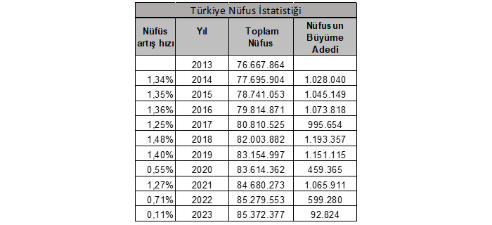 Türkiye Nüfusu 2023 yılı itibari ile 85.372.377 kişi, geçen yıla göre sadece 92.824 kişi arttı. Verileri değerlendiren EVA Gayrimenkul Değerleme Genel Müdürü Cansel Turgut Yazıcı, “Nüfus artış hızı hala pozitif yönde ama Türkiye nüfusunun artış hızı geçtiğimiz yıllara göre oldukça azaldı. Nüfusun artış hızı oranı son 10 yılda %1,34’ten %0,11’e geriledi. Bu şekilde giderse Türkiye nüfusu gelecek sene küçülebilir. Yani belki de ilk defa ölüm hızı doğum hızının altında kalabilir.” dedi.
