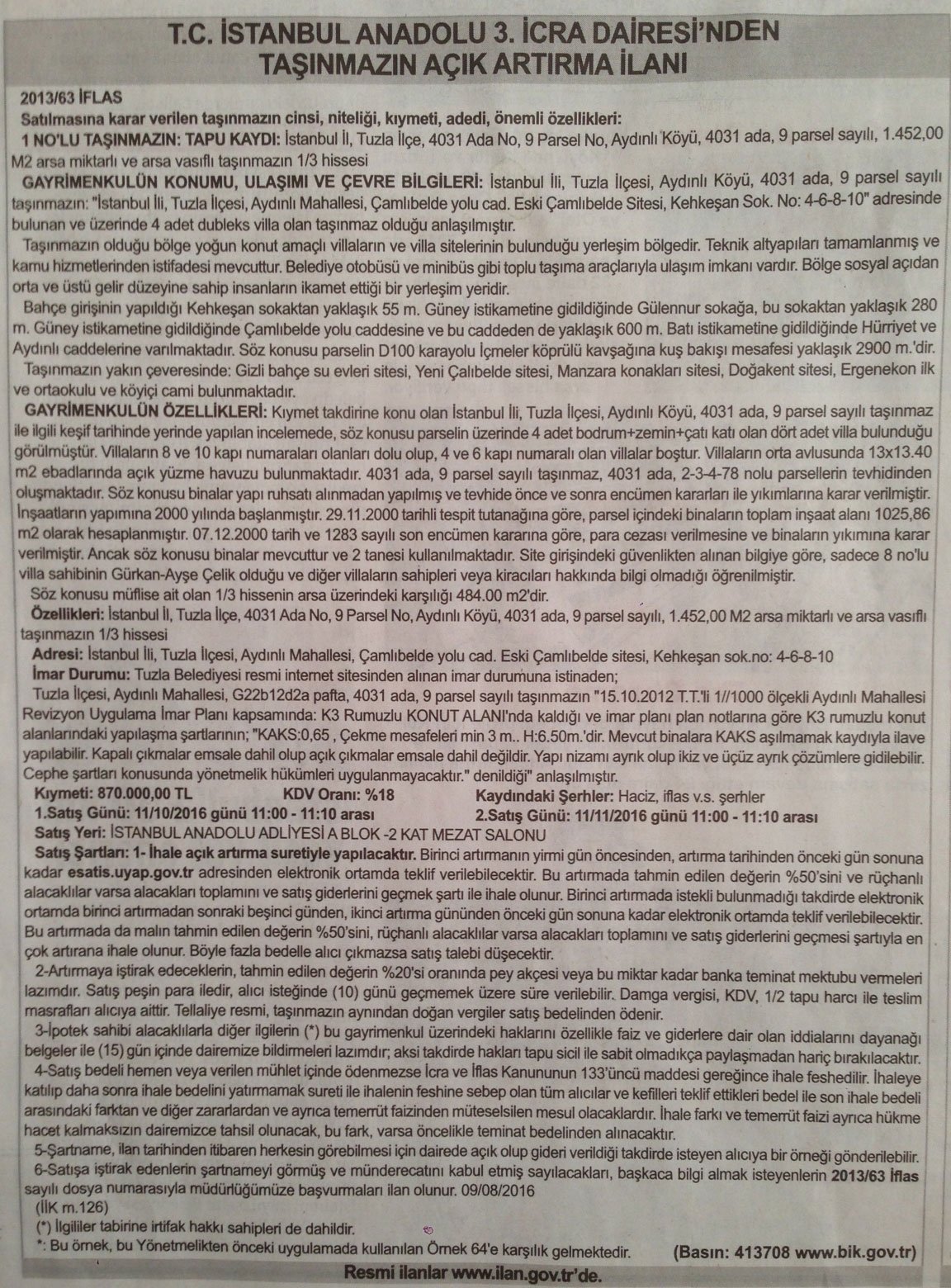 Tahmini fiyatı 870 bin lira olarak belirlenen taşınmazın satışı 11 Ekim 2016 tarihinde saat 11.00’de Anadolu Adliyesi A Blok 2. kat mezat salonunda gerçekleştirilecek. Talipli çıkmadığı takdirde ikinci satış 11 Kasım 2016 tarihinde aynı yer ve saatte tekrarlanacak.