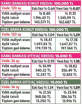 Özel bankalar, yüzde 1.20 ile 1.54 arasında değişen oranlarda konut kredisi faizi uygulamaya başladı. İhtiyaç kredilerinde de özel bankalarda yüzde 0.79’a kadar düşen faiz oranı görmek artık mümkün değil. Bankaların yüzde 1.29 ile yüzde 1.85’e kadar çıkan faiz oranlarıyla kredi kullandırıyor. Kredi kampanyalarının başladığı haziran ayında yüzde 0.82’ye kadar düşen taşıt kredisi faizleri de yüzde 1.44’e yükseldi.