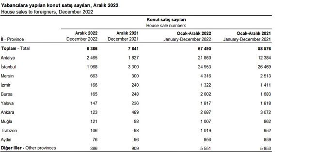 Antalya’yı mercek altına alan ve verileri değerlendiren Güder, “Türkiye genelinde 2022 yılında 67.490 adet yabancıya konut satıldı. 2022 yılında yabancılara yapılan konut satışlarında ilk sırayı 24 bin 953 konut satışı ile İstanbul alırken, İstanbul’u sırasıyla 21 bin 860 konut satışı ile Antalya, 4 bin 316 konut satışı ile Mersin izledi.
