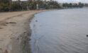 İlçe kıyısında deniz suyunun çekilmesi nedeniyle limandaki kayıklar karaya otururken, yosunlar yüzeye çıktı.