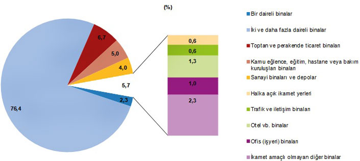 Kullanma amacına göre en yüksek pay %76,4 ile İki ve daha fazla daireli ikamet amaçlı binaların oldu