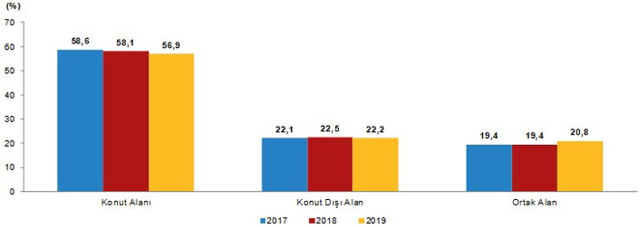 Yapı kullanma izin belgesi verilen yapıların 2019 yılında toplam yüzölçümü 149,3 milyon m2 iken; bunun 85,0 milyon m2’si konut, 33,2 milyon m2’si konut dışı ve 31,1 milyon m2’si ortak kullanım alanı olarak gerçekleşti.