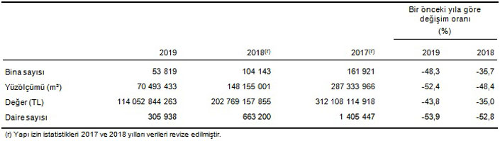 Belediyeler tarafından verilen yapı kullanma izin belgelerinin 2019 yılında bir önceki yıla göre, bina sayısı %26,6, yüzölçümü %14,5, daire sayısı %17,8 azalırken, değeri %0,2 arttı.