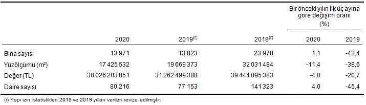 Belediyeler tarafından verilen yapı ruhsatlarının 2020 yılının ilk üç ayında bir önceki yıla göre bina sayısı %1,1 ve daire sayısı %4,0 artarken, yüzölçümü %11,4 ve değeri %4,0 azaldı.