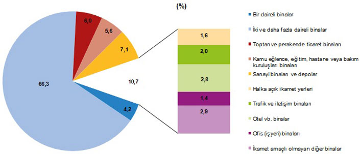 Yapı ruhsatı verilen yapıların 2020 yılının ilk üç ayında kullanma amacına göre 11,6 milyon m² ile en yüksek paya iki ve daha fazla daireli ikamet amaçlı binalar sahip oldu. Bunu 1,2 milyon m² ile sanayi binaları ve depolar izledi.