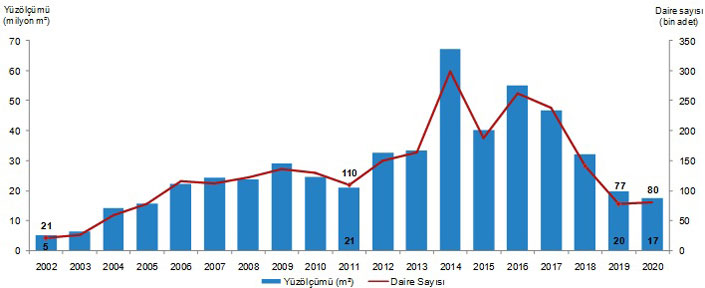 Yapı ruhsatı verilen yapıların 2020 yılının ilk üç ayında toplam yüzölçümü 17,4 milyon m² iken; bunun 8,8 milyon m²’si konut, 5,4 milyon m²’si konut dışı ve 3,2 milyon m²’si ise ortak kullanım alanı olarak gerçekleşti.