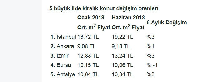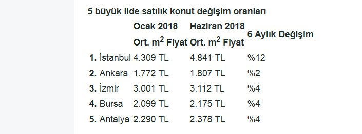 Türkiye geneline bakıldığında ise son dönemde devam eden trendin geçerliliğini koruduğu gözlendi. Geçtiğimiz Ocak ayından Haziran ayının sonuna kadar olan 6 aylık dönem içerisinde Türkiye genelinde satılık konutlarda fiyat artış oranı metrekare başına yüzde 9 ve kiralık konutlardaki artış oranı ise yüzde 6,7 olarak gerçekleşti. Foça, Karaburun, Kemer gibi yazlık bölgelerde artışların devam ettiği, tatil bölgeleri olarak bilinen sahil kasabalarının birçoğunda yazın ilerlemesiyle beraber artışlar görüldü.
