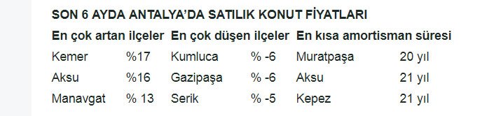 Antalya’da satılık konut fiyatları son 6 aylık dönemde yüzde 4 arttı. Son 6 ayda fiyatı en çok artan ilçeler yüzde 17 ile Kemer ve yüzde 16 ile Aksu oldu. Kumluca ve Gazipaşa ilçelerinde geçtiğimiz altı aylık ortalamaya göre fiyatlar yüzde 6 oranında düştü. Bu ilimizde amortisman süresi 21 yıl olarak tespit edildi.