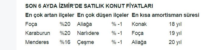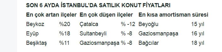 İstanbul genelindeki ortalamaya göre son 6 ay içerisinde satılıklarda yüzde 12 ve kiralıklarda ise yüzde 3 seviyesinde artış görüldü. İstanbul’un en çok artış gösteren ilçeleri Beykoz, Eyüp ve Beşiktaş oldu. Ankara’da Yenimahalle ve İzmir’de ise Foça en çok artış yakalayan ilçeler arasına girdi. Öte yandan 6 aylık ortalamada fiyatların yüzde 1 düştüğü Çeşme ise genel anlamda en büyük sürprizi yaptı.