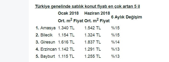 Hürriyet Emlak Haziran 2018 Emlak Endeksi verilerine göre, Türkiye genelinde satılık konutlarda metrekare ortalama fiyatı 2 bin TL olarak hesaplanırken kiralıklarda ise metrekare ortalaması 9 TL oldu. Ülke genelinde konutların amortisman süresi ise ortalama 21 yıl olarak hesaplandı. Ocak ayından bu yana geçen 6 aylık sürede Türkiye genelinde satılık konut fiyatı en çok artan şehir yüzde 15 artışla Amasya oldu. Bu ilimizi Bilecik, Giresun, Erzincan ve Bayburt takip etti.