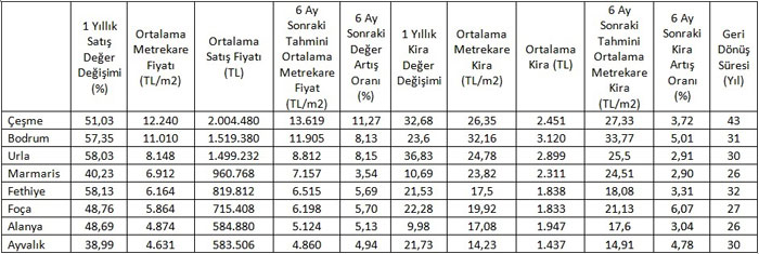 Bodrum’da ise konut satış fiyatları son bir yılda %57,35 artış gösterdi, ortalama konut metrekare satış fiyatı 11.010 TL, ortalama konut fiyatı 1.519.380 TL; kira değerleri son bir yılda %23,6 artış gösterdi, ortalama metrekare kira 32,16 TL, ortalama kira 3.120 TL. Bodrum’da 6 ay sonraki satış fiyatı artış beklentisi %8,13, kira artış beklentisi ise %5,01 seviyesinde.