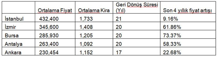 Ortalama değerlerle İzmir’de konut satış fiyatı 345.600 TL, kira 1.408 TL, konut yatırımının geri dönüş süresi 20 yıl. Bursa’da konut satış fiyatı 285.930 TL, kira 1.205 TL, geri dönüş süresi 20 yıl. Antalya’da konut satış fiyatı 263.400 TL, kira 1.092 TL, geri dönüş süresi 20 yıl. Ankara’da konut satış fiyatı 230.454 TL, kira 1.152 TL, geri dönüş süresi 17 yıl.