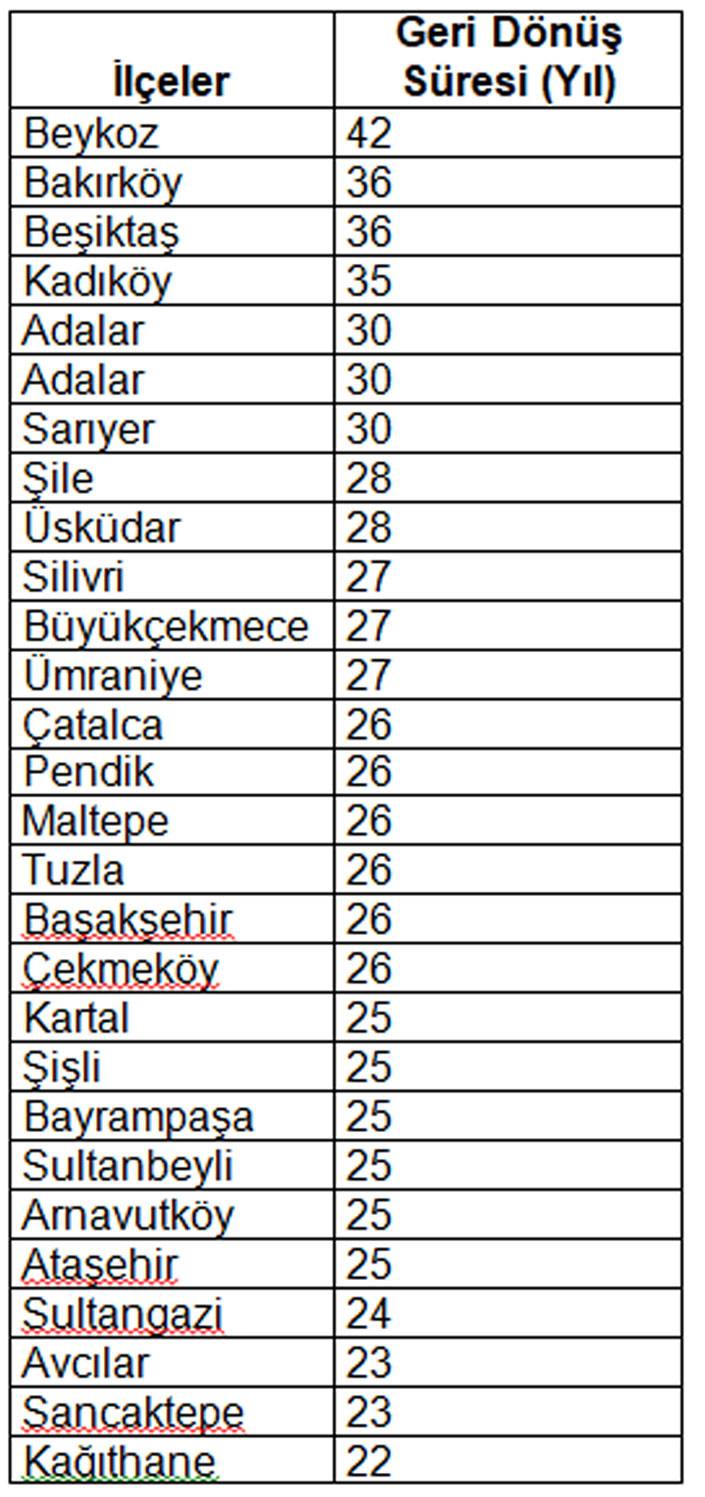 Yazlık bölgeler ile karşılaştırma yapmak açısından İstanbul’un ilçelerindeki geri dönüş süreleri ise aşağıda tabloda belirtiliyor.