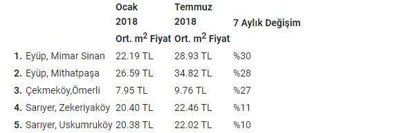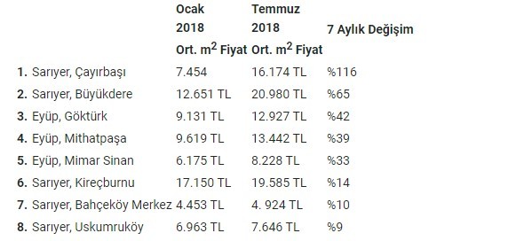 Hürriyet Emlak ilanları üzerinden oluşturulan verilere göre Yeni Havalimanı güzergahındaki Sarıyer Çayırbaşı Mahallesi, Ocak 2018’den Temmuz 2018’e satılık konut fiyatlarında gerçekleşen yüzde 116’lık artışla liste başında yer aldı.