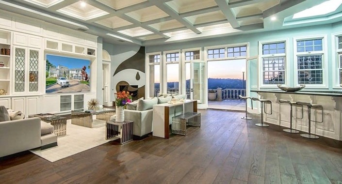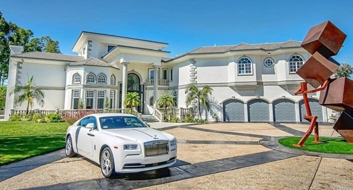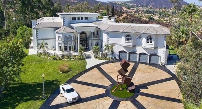 Havuzu, arka bahçedeki iki şelaleli peyzajı ve 4 araç ve 12 motor alabilen garajıyla birlikte ev neredeyse 14 bin metrekare araziye yayılıyor.