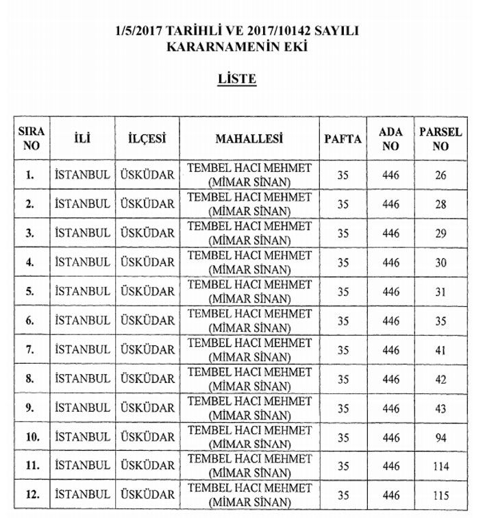 Resmi Gazete’de açıklanan ve Bakanlar Kurulu’ndan çıkarılan acele kamulaştırma kararı ile Üsküdar Tembel Hacı Mehmet Mahallesi (Mimar Sinan) 446 ada içinde 12 parsel kamulaştırılacak.