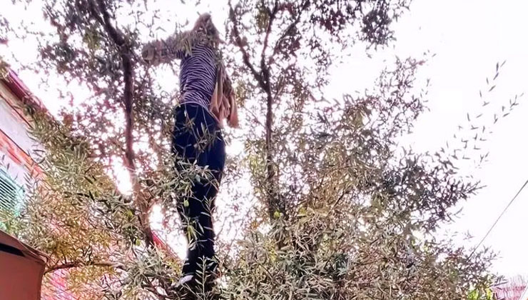 Daha önce yaptığı bir açıklamada, “Kendi yerimiz olduğu için küllük de temizledik masa da topladık” diyen Burcu Biricik, şimdi de otelin bahçesinde bulunan zeytin ağacına çıkıp zeytin topladı.